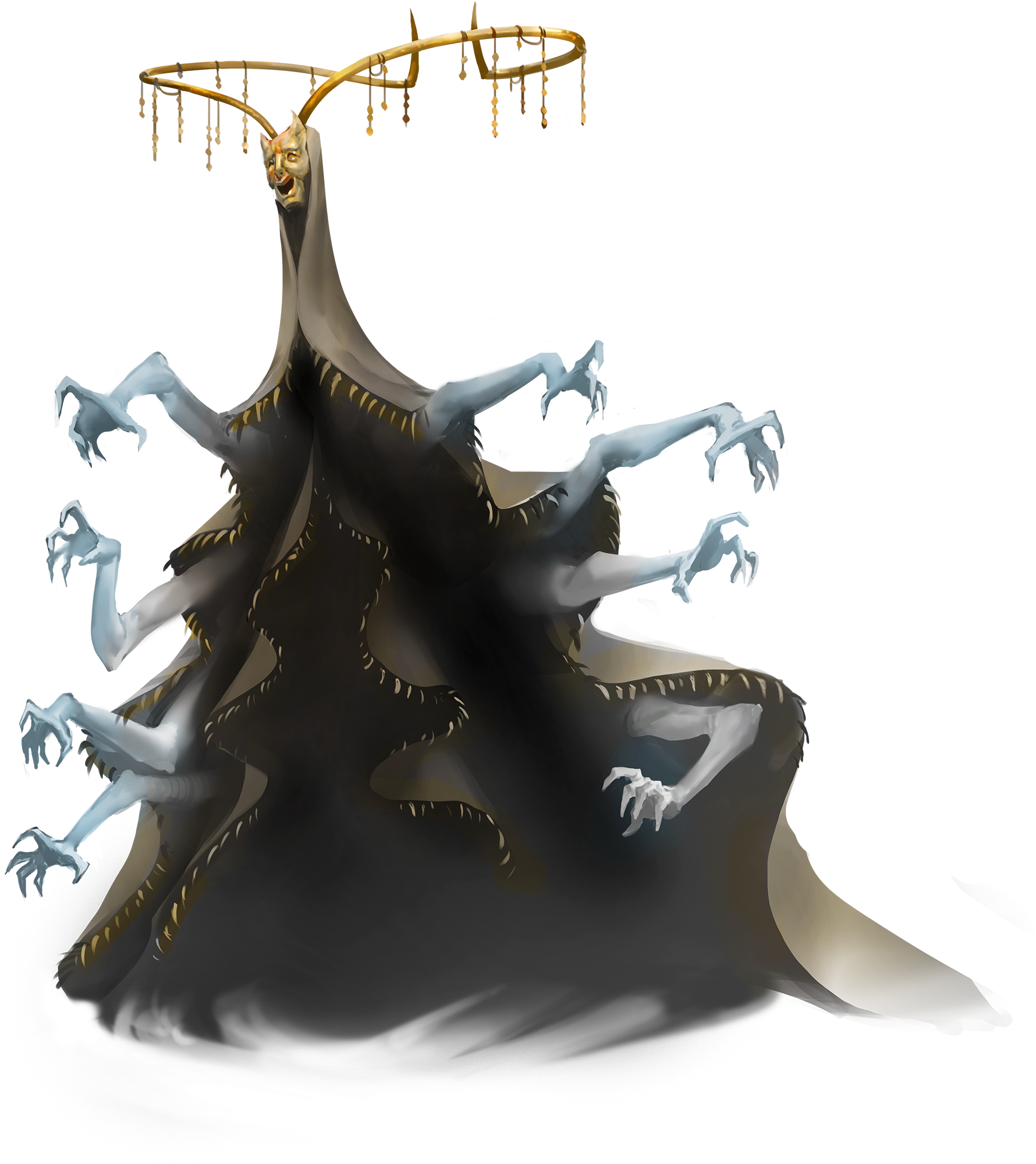 A regal cloaked monstrosity with circular horns adorned with treasure.