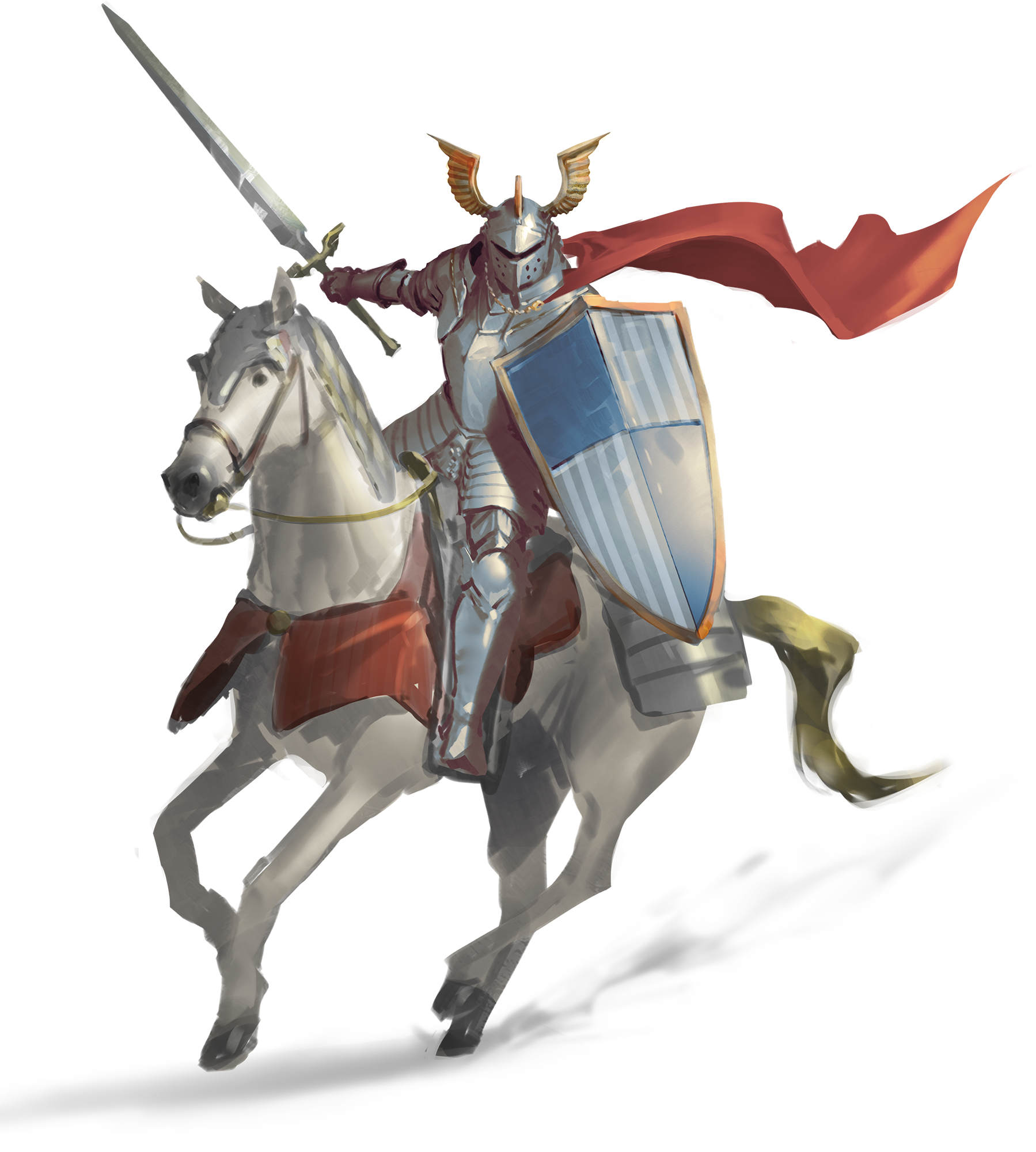 A decorated soldier with heavy armor and a powerful steed.