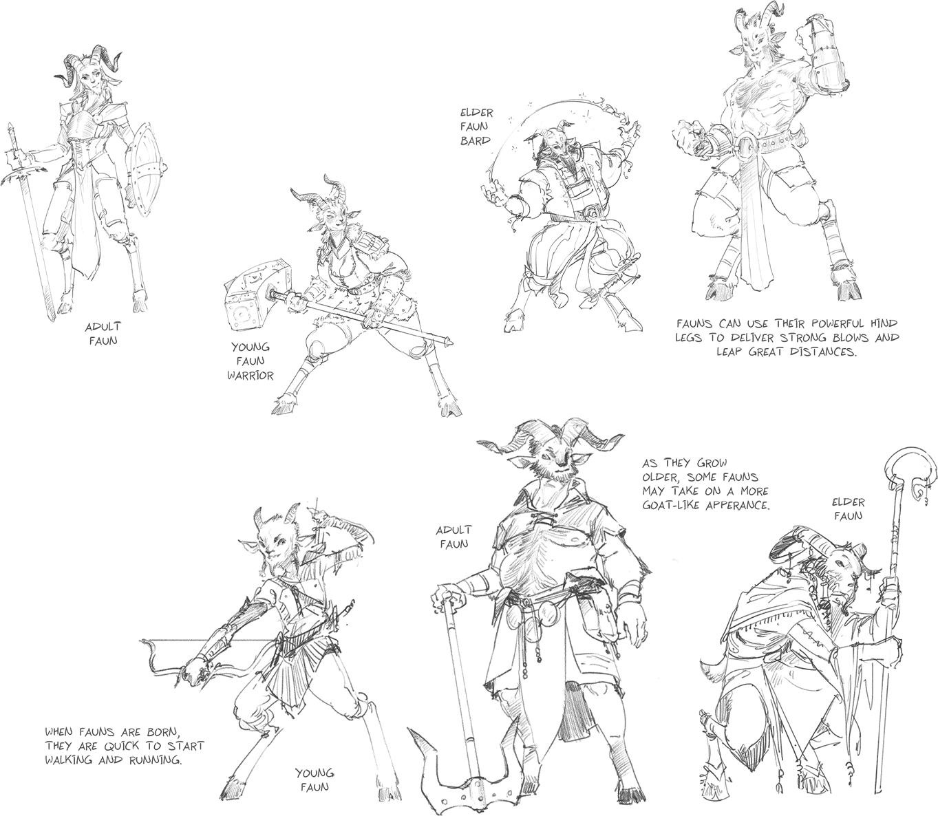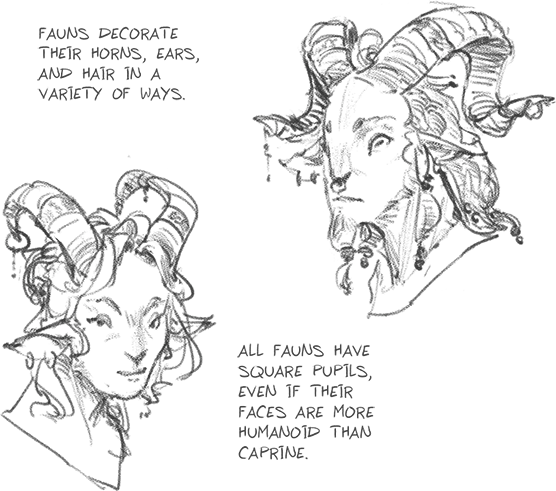 Fauns decorate their horns, ears, and hair in a variety of ways. All Fauns have square pupils, even if their faces are more humanoid than caprine. Fauns can use their powerful hind legs to deliver strong blows and leap great distances. When Fauns are born they are quick to start walking and running. As they grow older, some Fauns may take on a more goat-like appearance.