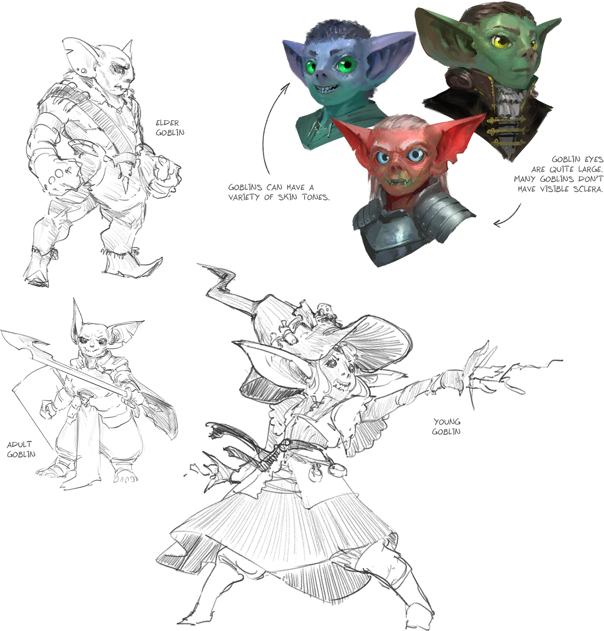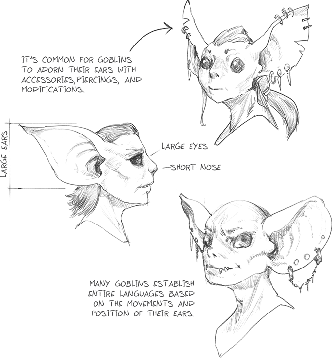With keen hearing and sharp eyesight, they perceive details both at great distances and in darkness, allowing them to move through less-optimal environments with ease. Their skin and eye colors are incredibly varied, with no one hue, either vibrant or subdued, more dominant than another. A typical goblin stands between 3 feet and 4 feet tall, and each of their ears is about the size of their head. Goblins are known to use ear positions to very specific effect when communicating nonverbally. A goblin’s lifespan is roughly 100 years, and many maintain their keen hearing and sight well into advanced age.