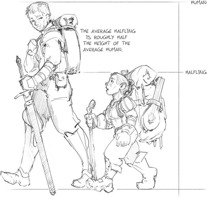 Halflings are small humanoids with large hairy feet and prominent rounded ears.