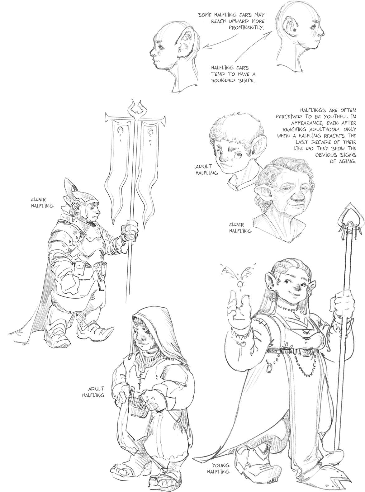 The average Halfling is roughly half the height of the average human. Halflings are often perceived to be youthful in appearance, even after reaching adulthood. Only when a Halfling reaches the last decade of their life do they show the obvious signs of aging. Some Halfling ears may reach upward more prominently. Hafling ears tend to have a rounded shape.
