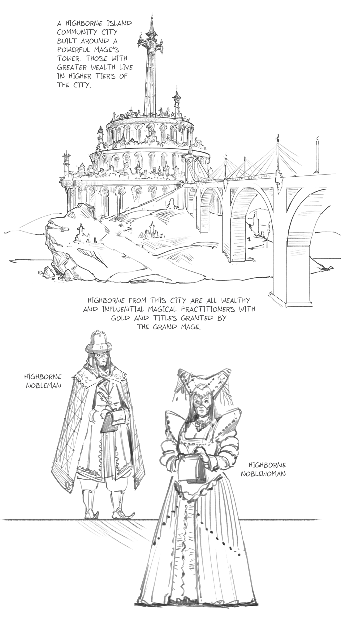 A Highborne island community city built around a powerful mage’s tower. Those with greater wealth live in higher tiers of the city. Highborne from this city are all wealthy and influential magical practitioners with gold and titles granted by the grand mage.