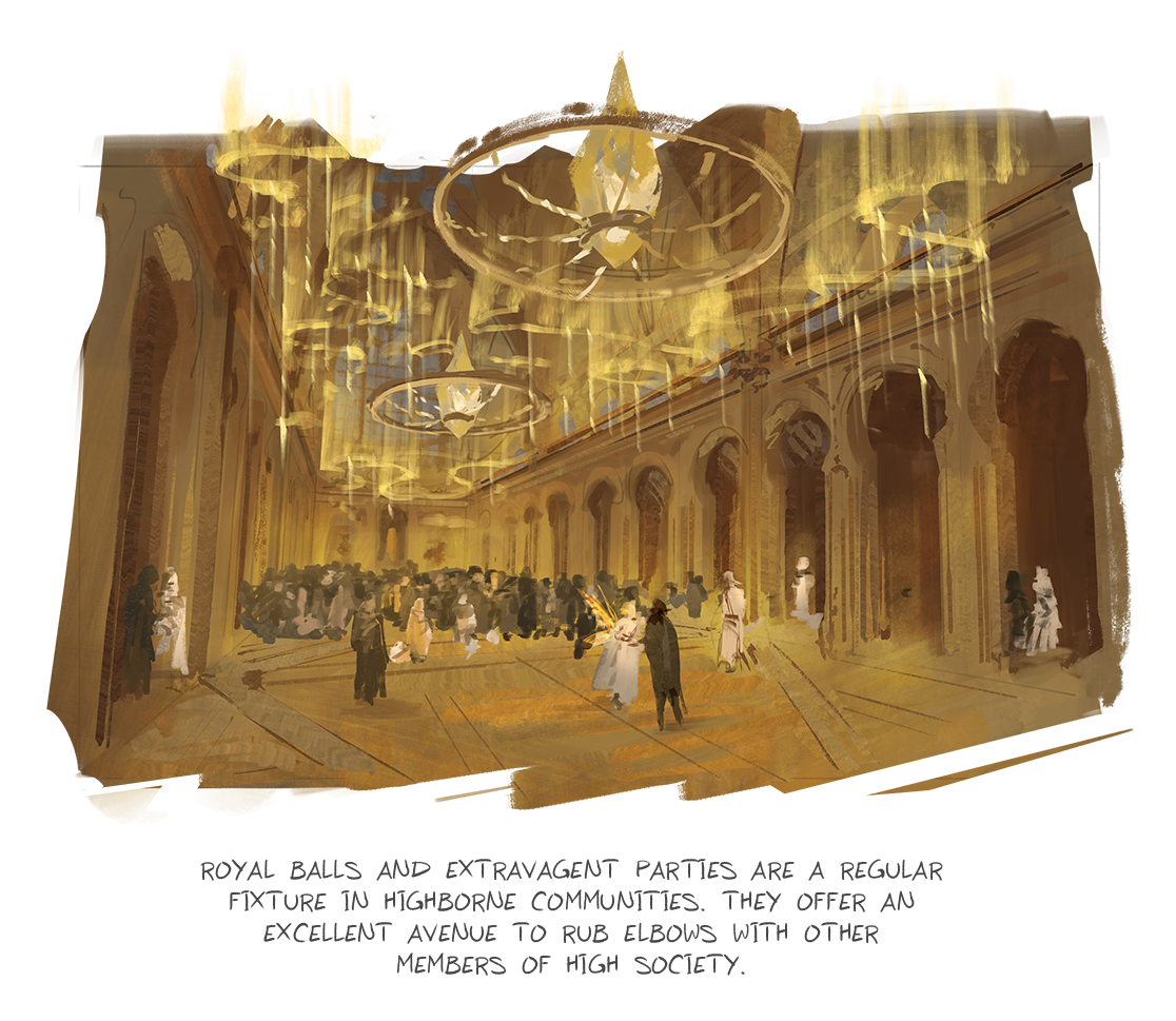 Royal balls and extravagant parties are a regular fixture in Highborne communities. They offer an excellent avenue to rub elbows with other members of high society.