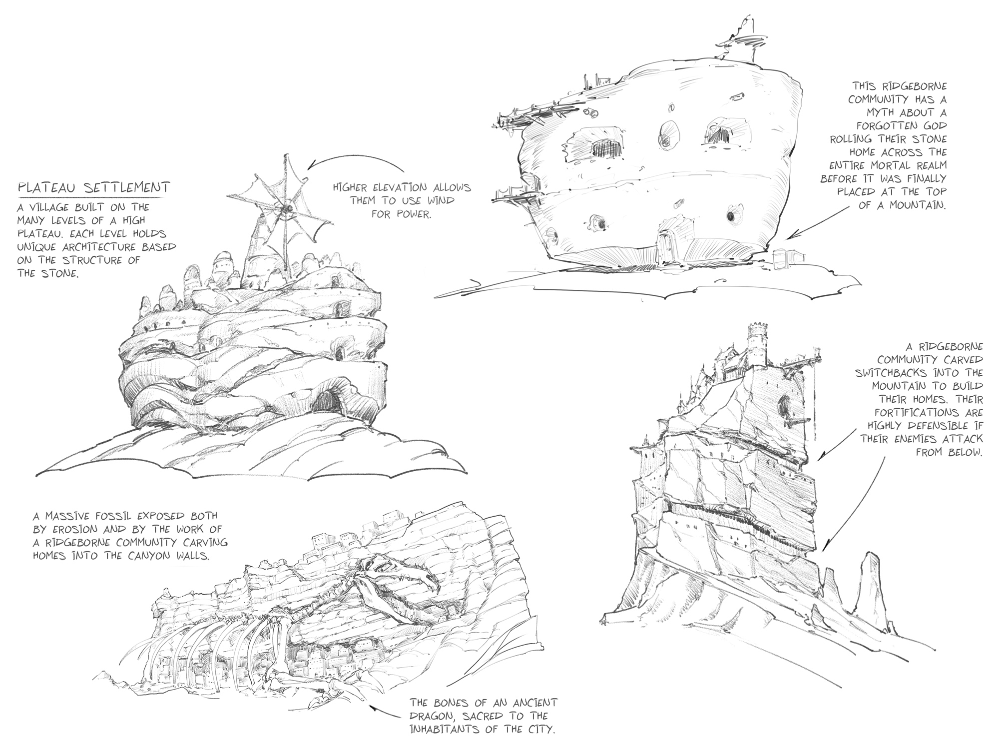 Plateau Settlement: A village built on the many levels of a high plateau. Each level holds unique architecture based on the structure of the stone. Higher elevation allows them to use wind for power. A massive fossil exposed both by erosion and by the work of Ridgeborne community carving homes into the canyon walls. The bones of an ancient dragon, sacred to the inhabitants of the city. The Ridgeborne community has a myth about a forgotten god rolling their stone home across the entire mortal realm before it was finally placed at the top of a mountain. A Ridgeborne community carved switchbacks into the mountain to build their homes. Their fortifications are highly defensible if their enemies attack from below.