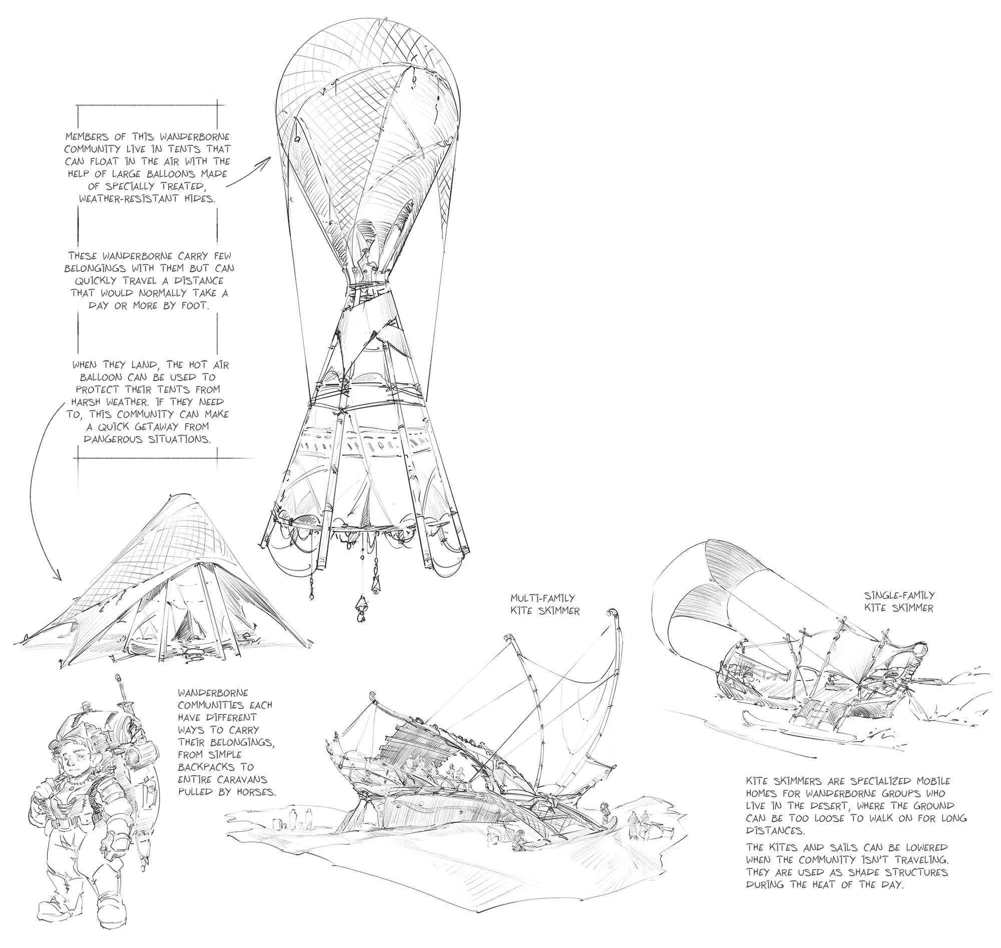 Members of this Wanderborne community live in tents that can float in the air with the help of large balloons made of specially treated, weather-resistant hides. These Wanderborne carry few belongings with them but can quickly travel a distance that would normally take a day or more by foot. When they land, the hot air balloon can be used to protect their tents from hard weather. If they need to, this community can make a quick getaway from dangerous situations.